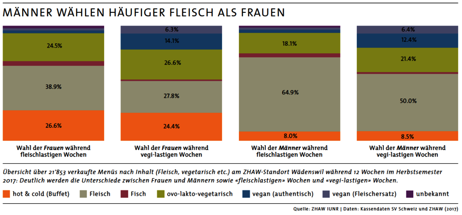 Die Befragungen haben auch ergeben, dass viele Köche die Nachfrage nach vegetarischen und veganen Gerichten als Störung empfinden: Ihre Zubereitung ist oft aufwendiger und erfordert spezifisches Know-how. Als Gegenstrategie empfehlen die Forscher eine vermehrte Spezialisierung in der Küche. «Wir schlagen vor, eine Lehre für Vegiköche einzuführen oder zumindest eine entsprechende Spezialisierung innerhalb der bestehenden Kochlehre anzubieten», sagt Priska Baur. «So eine Lehre würde vermehrt auch für die Vegi-Küche besonders motivierte Menschen ansprechen.» Heute stehen in vielen Gastronomiebetrieben Männer am Herd. Sie kochen, so die pointierte Hypothese der ZHAW-Forschenden, für ihresgleichen – also Fleisch. Denn Männer wählen häufiger Fleisch als Frauen (vgl. Abbildung).