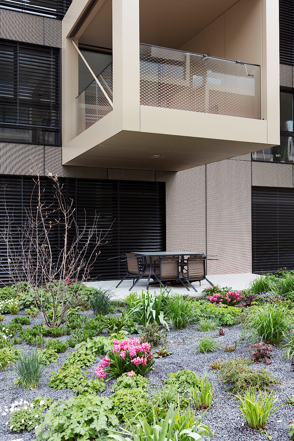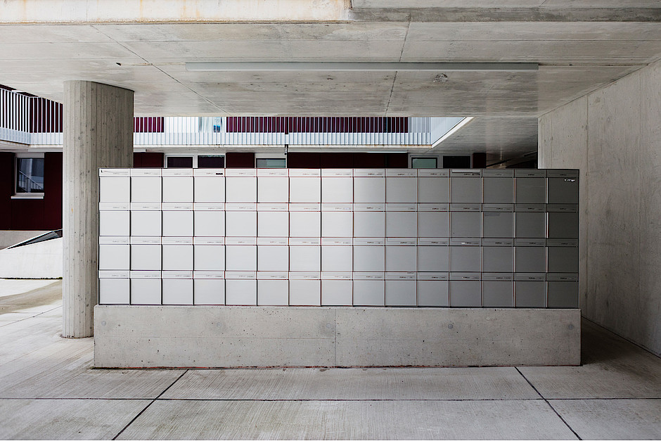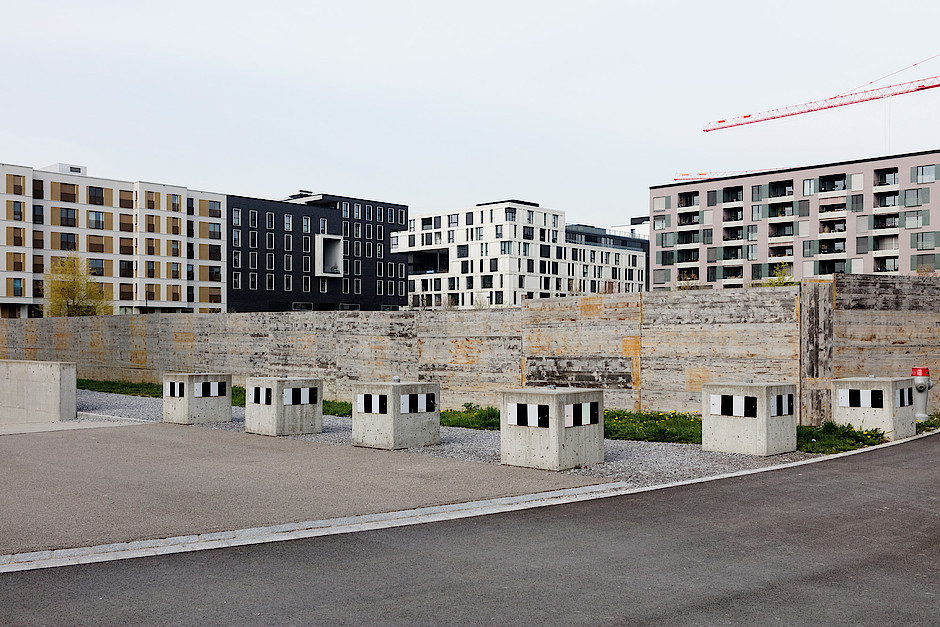 Die DNA des neuen Stadtteils ist der gut durchdachte Masterplan des Büros Planpartner. «Klug aufgebaut, regelt er nur das Nötigste und lässt genug Freiraum für neue Entwicklungen über die lange Bebauungszeit von mehreren Jahrzehnten hinweg», sagt Roland Züger. Während wir dem Boulevard entlangschlendern, zeigt er auf ein eigenwilliges Gebäude in dunkler Blechhaut: «Minmax» will mit 40 Quadratmeter grossen Kleinwohnungen für Singles ein Segment abdecken, das im neuen Stadtteil zuvor zu kurz kam – im Hof zeugt prominent ein gläserner Turm mit zwei Waschsalons und einer Gemeinschaftsküche von diesem Anspruch.