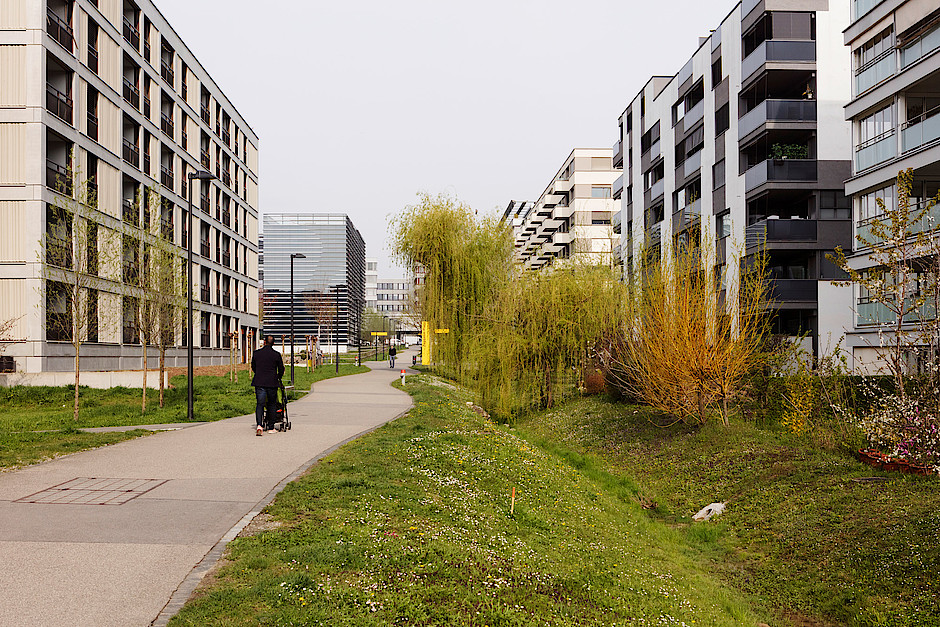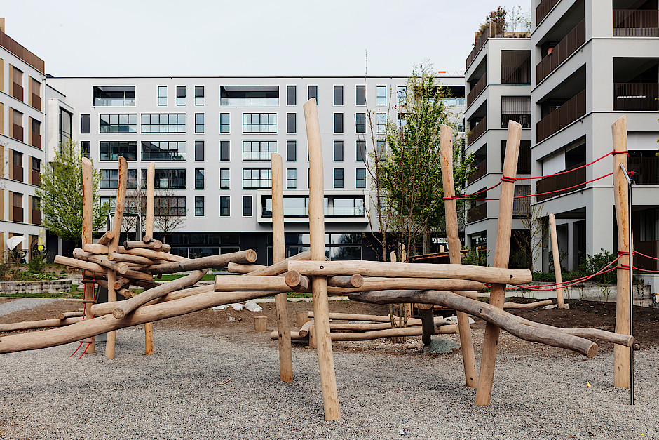 Bevor der Stadtspaziergang mit Roland Züger, Dozent am ZHAW-Institut Urban Landscape, jedoch dorthin ins Grün führt, gibt es einen kurzen Zwischenstopp. Er gilt den kürzlich fertiggestellten Bauten der zweiten Etappe an der Ecke des Quartiers zum Fernsehstudio. Zum einen hat die Genossenschaft ABZ hier 286 Wohnungen erstellt, die neue Bevölkerungsschichten ins bei Expats beliebte Quartier bringen. Das lässt sich an der Architektur ablesen: Gemeinschaftsräume und Ateliers im Erdgeschoss, eine begegnungsfreundliche Erschliessung durch offene, aussenliegende Treppenhäuser, Familienwohnungen und kleinere Einheiten fürs Wohnen ab 65. Zwischen den beiden Baukörpern liegen kollektive Gärten und Kinderspielplätze.