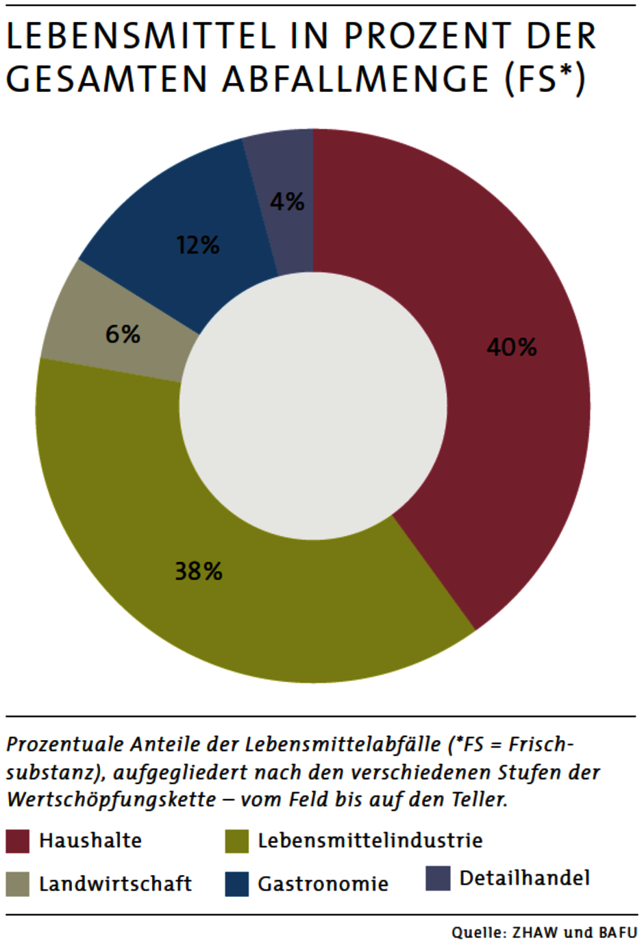 Die Landwirtschaftsstudie hat hingegen ergeben, dass auf dieser Stufe vergleichsweise wenig Abfälle entstehen. Dazu gehören Gemüse oder Obst, die den Marktvorgaben nicht genügen, oder Ernten, bei denen aus Gründen der Effizienz nicht zwischen verwertbaren und verdorbenen Lebensmitteln unterschieden wird. Urs Baier gibt zudem zu bedenken, dass die Landwirtschaft als erstes Glied in der gesamten Wertschöpfungskette aus energetischer Sicht viel weniger kritisch ist als Konsumenten: «Wenn der Bauer ein Rüebli wegwirft, kommt dieses direkt aus der Erde. Tut dies der Konsument, hat es schon Transportwege zurückgelegt und Verarbeitungsmaschinen passiert.»