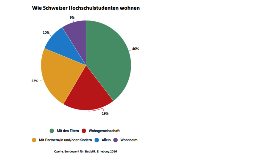 Laut dem Bundesamt für Statistik ist es im Raum Zürich überdurchschnittlich schwierig, ein WG-Zimmer zu finden. Im Jahr 2016 gaben 53 Prozent der Hochschulstudenten an, dass sie bei der Suche Mühe hatten. Im Schweizer Durchschnitt fiel dies 45 Prozent der Studenten schwer. Wenn man nicht fündig wird, bleibt eine Lösung: das Elternhaus. 40 Prozent haben angegeben, noch bei den Eltern zu wohnen (siehe Infografik). Sobald die Studenten von daheim bis zur Fachhochschule oder Universität lange pendeln müssen, suchen sie lieber nach Alternativen.